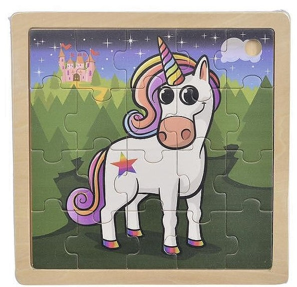 Този прекрасен пъзел представя усмихнат еднорог с дъговидна грива и рог, на фона на омагьосан замък и звездно небе. Изработен от висококачествено дърво, пъзелът е здрав, издръжлив и напълно безопасен за детски ръце.